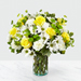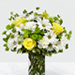 It’s amazing the effect flowers can have on its recipient. Through a collection of yellow roses and luminous bupleurum all set within a recycled cylindrical glass vase, our Happy Day bouquet is sure to bring a smile to the face of whoever it’s given to. Add the combination of white daisy pompon and green button pompon, and you’ll be making their day brighter with each sunny petal. GOOD bouquet is approx. 14″H x 14″W. BETTER bouquet is approx. 15″H x 15″W. BEST bouquet is approx. 16″H x 16″W.
