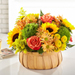 "Rustic, natural beauty and vibrant shades are used to create our Harvest Sunflower™ Basket. A mix of bold sunflowers, roses and dianthus complement your most heartfelt messages of comfort during times of sensitivity.