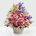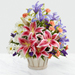 The FTD® Wondrous Nature™ Bouquet is bountifully bedecked with a dazzling display of color and beauty. Stargazer lilies stretch their fuchsia petals out amongst an arrangement of blue iris, white traditional daisies, orange mini carnations, purple statice, and yellow solidago in a round whitewash handled basket, creating a delightful bouquet your special recipient will adore.